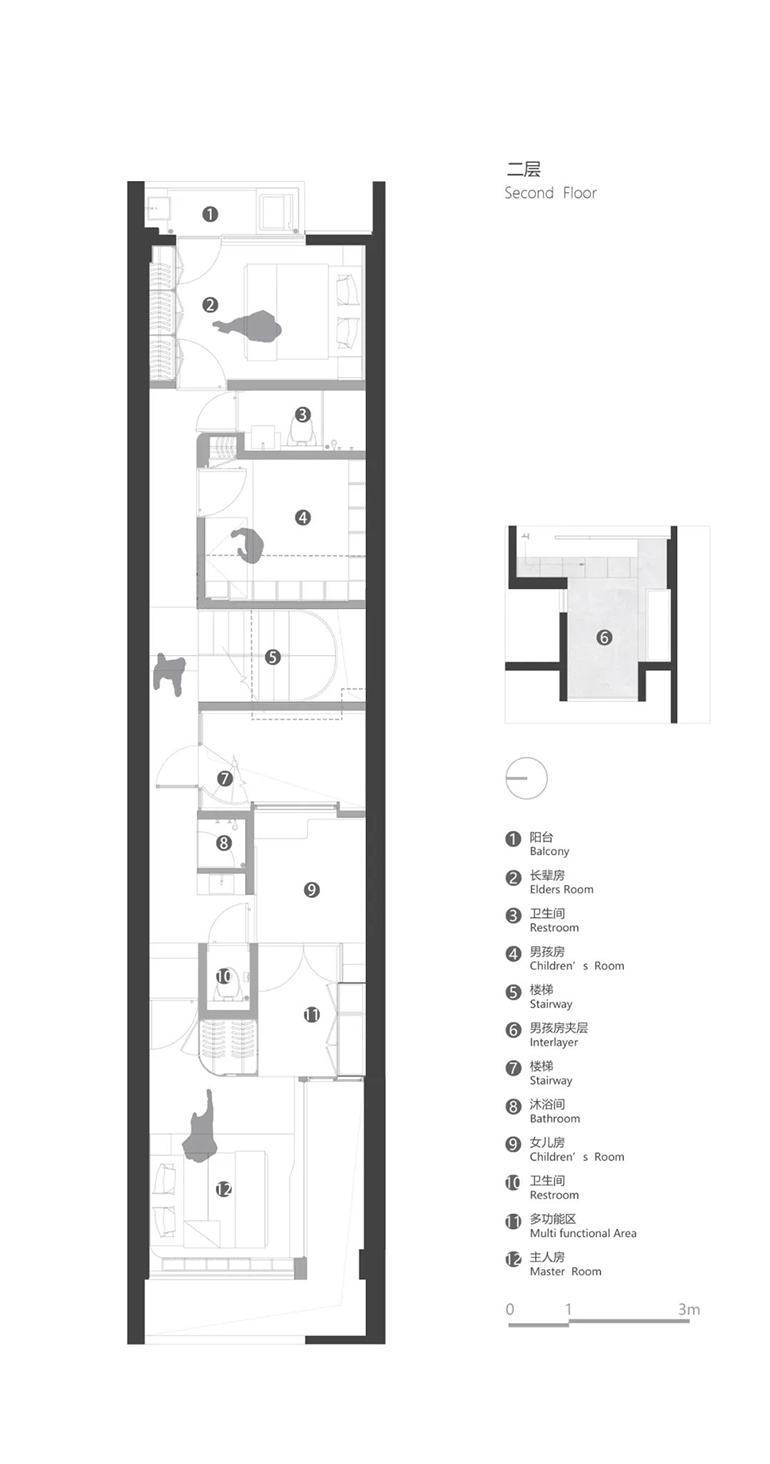 二层往老人房一侧,增加了多种适老化的装置设施,并在老人房的阳台中,为爷爷保留了养鱼的天地