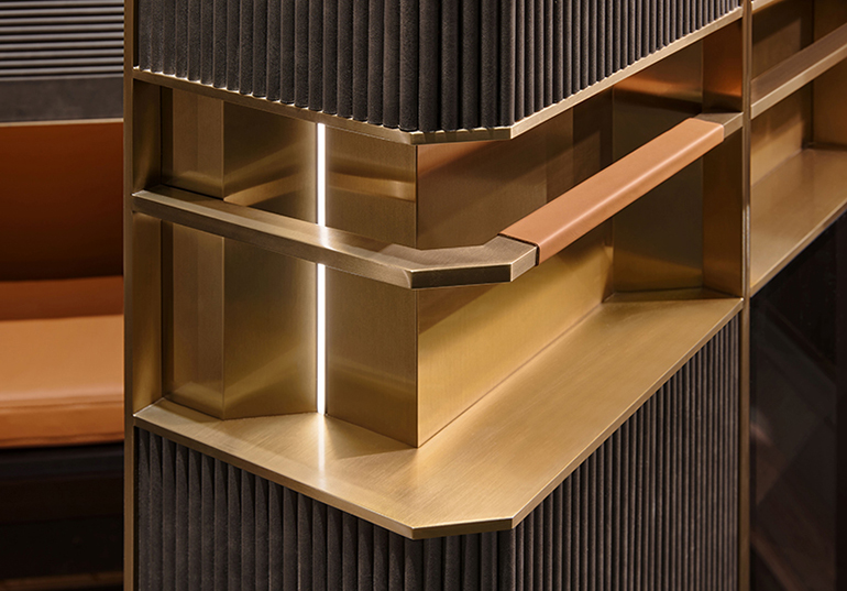 The light colors of the collection, such as light wood, red quilting and camel-colored leather, in addition to metallic and water-grained glass, present an elegant, refined and soft atmosphere.